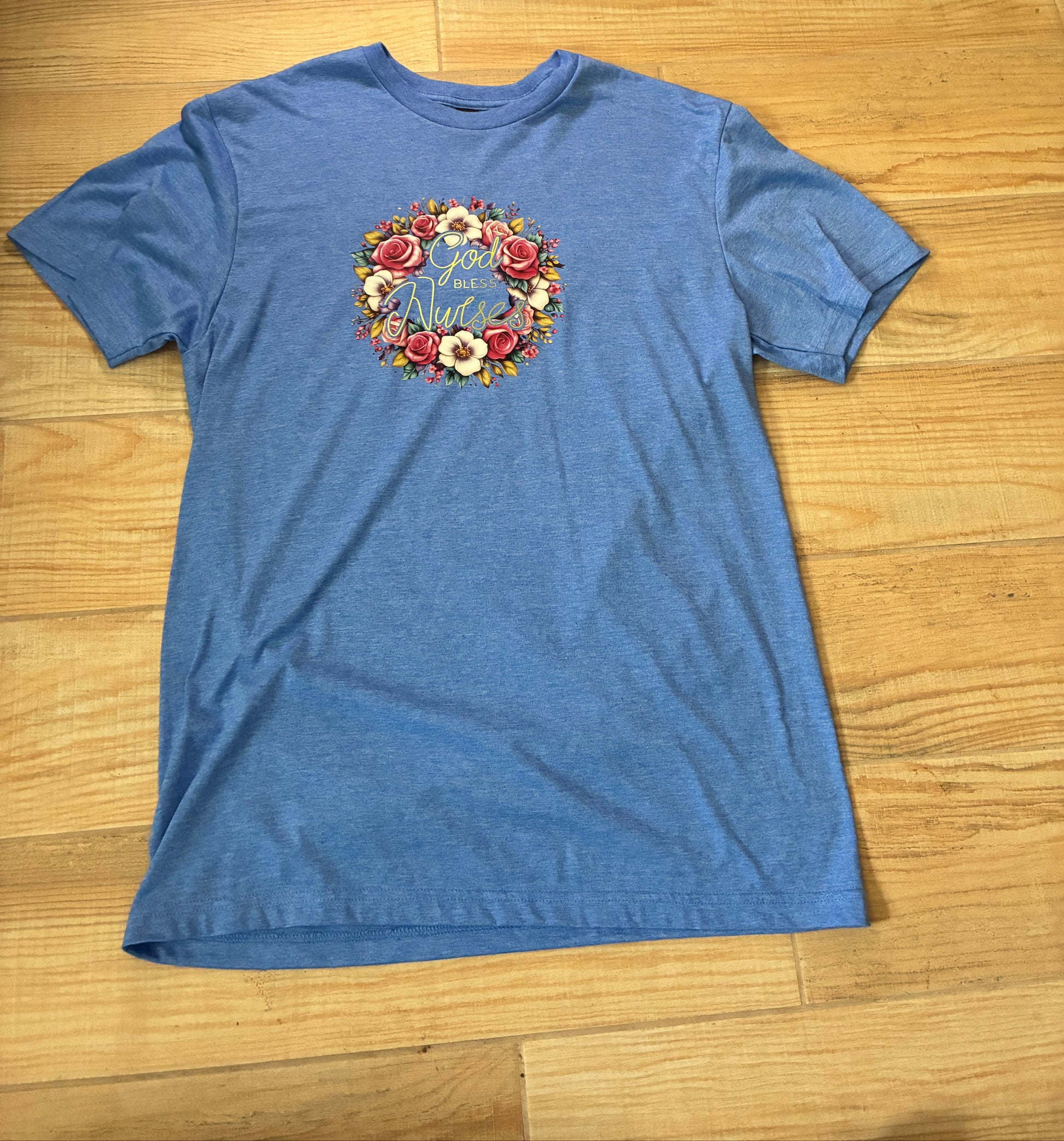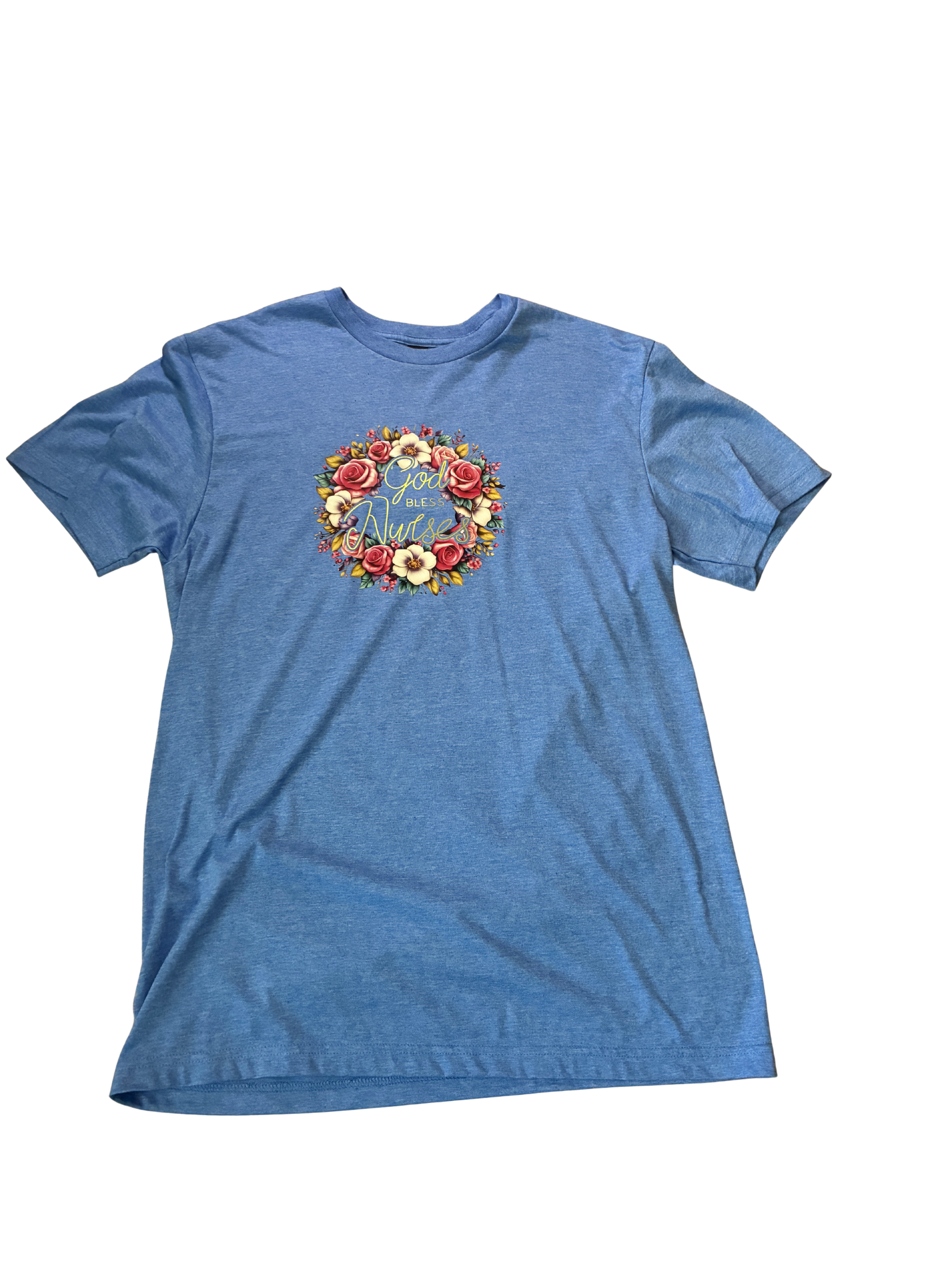 God Bless Nurses DTF press on design, Blue Gildan SoftStyle shirt. Size M